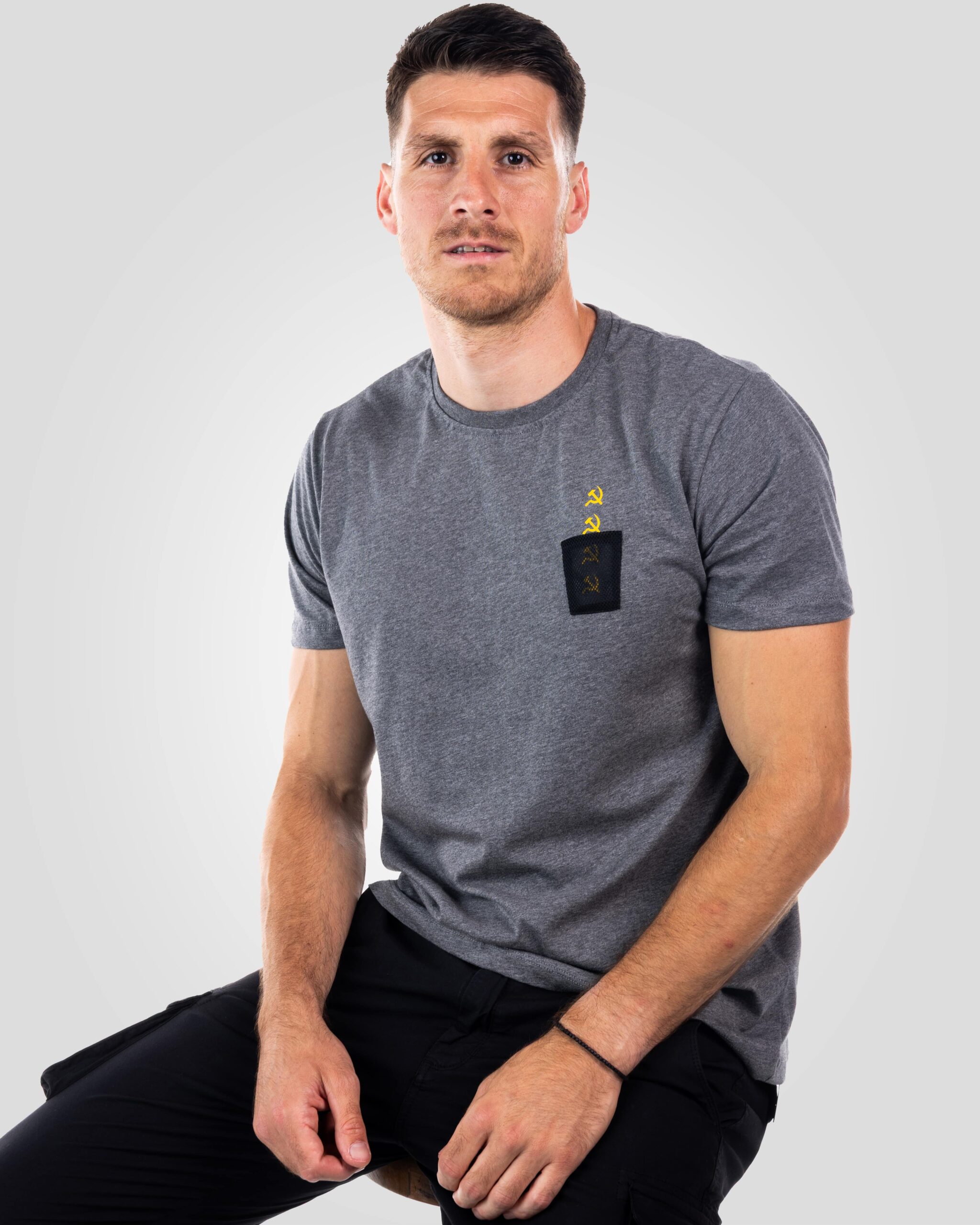 Модел је одрађен од најквалитетнијег меланж памука који је увезен специјално за овај модел. С обзиром да је 100% памук, модел је благо регуларног кроја. На срцу се налази канта од пришивене мрежице док је на рамену посебно дизајнирани силиконски пришивач.