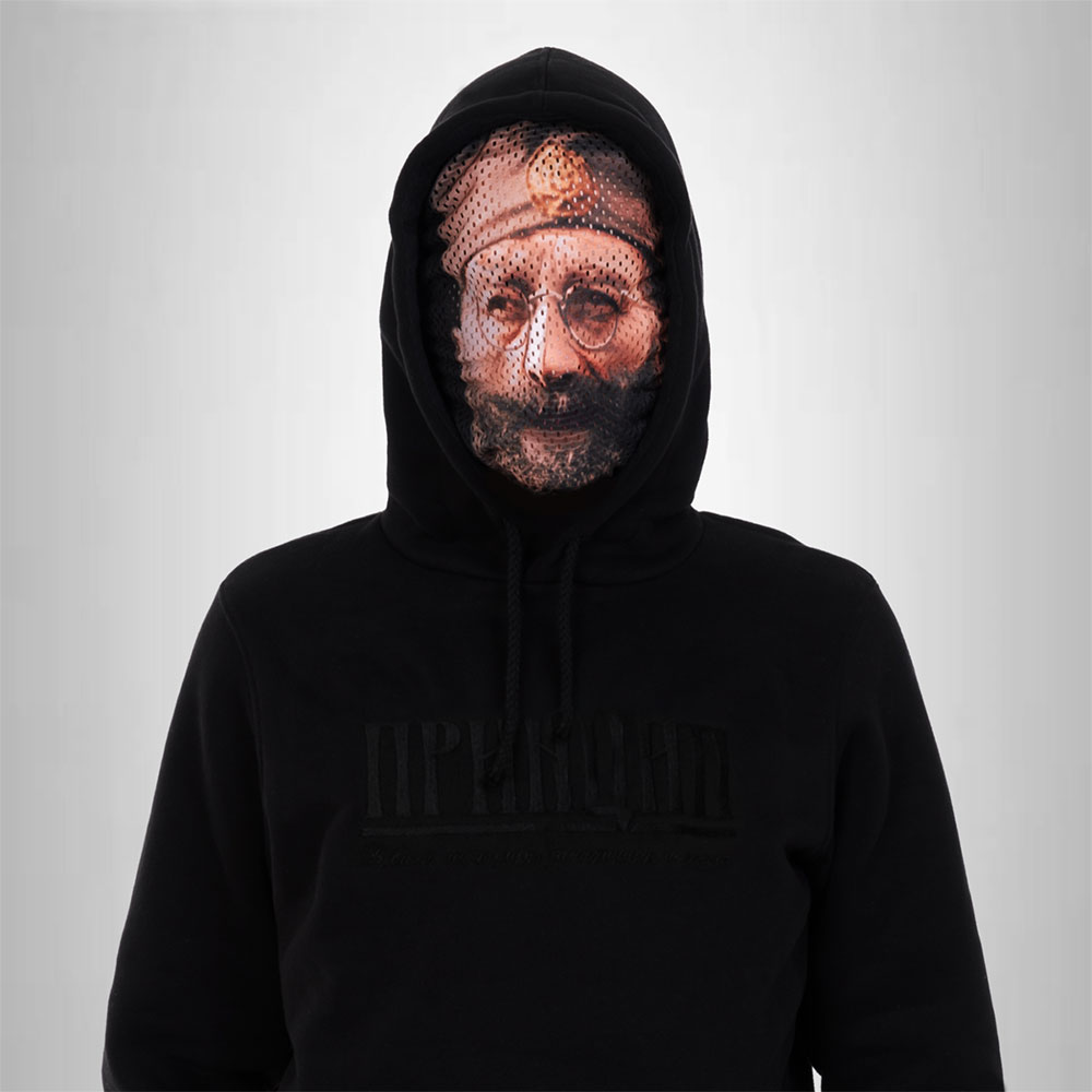 На дну капуљаче се налази пришивена мрежица са ликом Ђенерала Драже Михаиловића, која се по потреби извлачи и враћа. Кроз њу се лагодно може и дисати и гледати. На грудима се у пуном везу налази лого “Принцип”, који може бити у црној или оригинал бојама лога. Писаним словима испод лога је извезен текст: “Чувамо историју, традицију и хероје!”. Заједно васкрсавамо наше јунаке и чувамо историју и традицију од заборава..